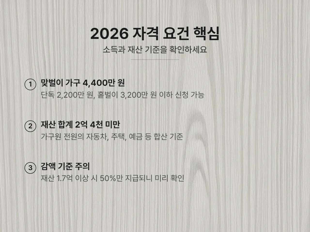 가장 먼저 확인해야 할 것은 내가 신청 자격이 되는지입니다. 올해는 소득 상한선이 조금 더 완만해지면서 더 많은 분이 혜택을 볼 수 있게 되었습니다.