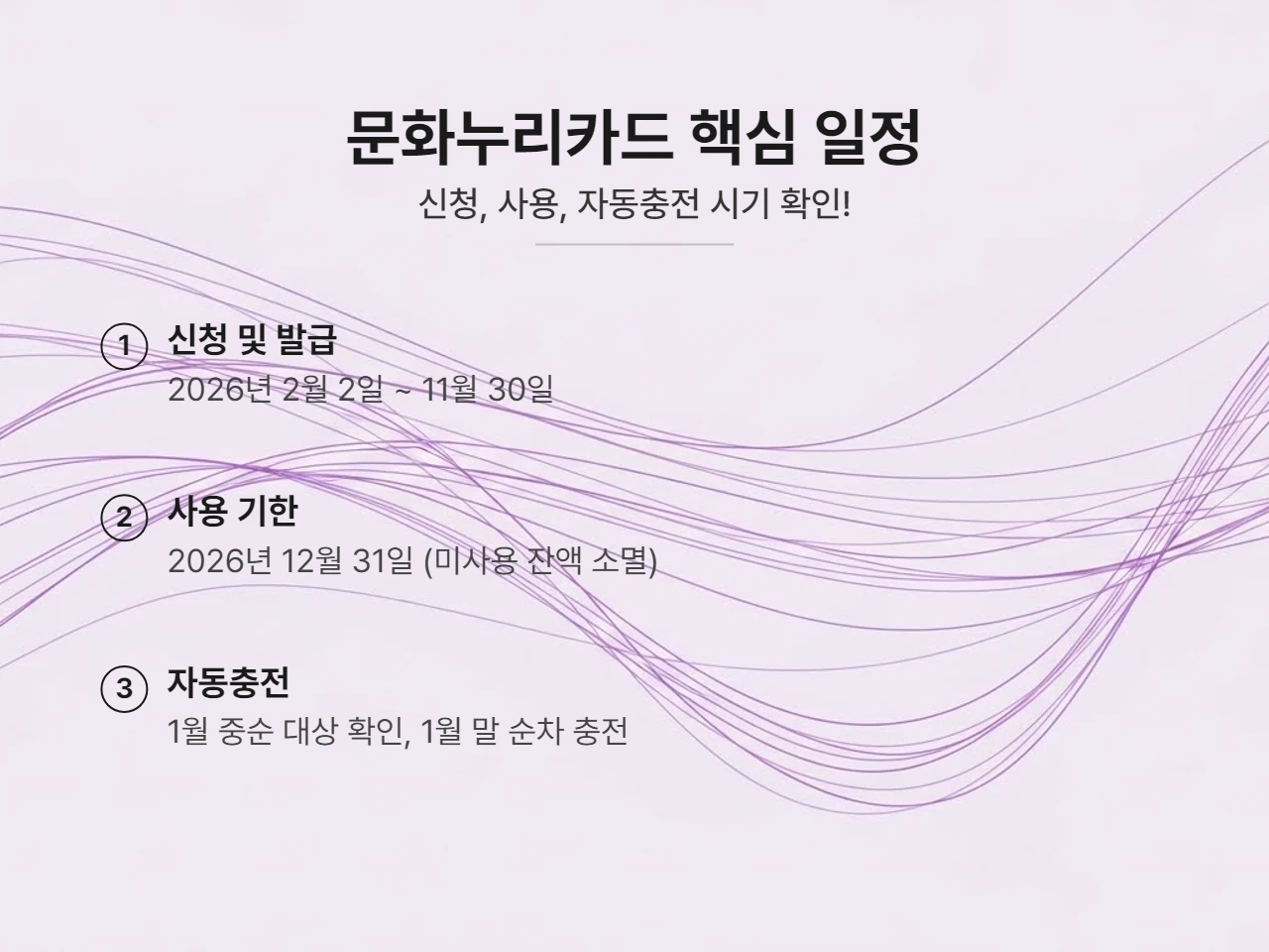문화누리카드의 혜택을 온전히 누리려면 핵심 일정을 정확히 아는 것이 중요합니다. 저도 작년에 신청 기간을 놓칠 뻔해서 아찔했던 기억이 있어요. 2026년에는 이런 실수가 없도록 미리미리 확인해두자고요!