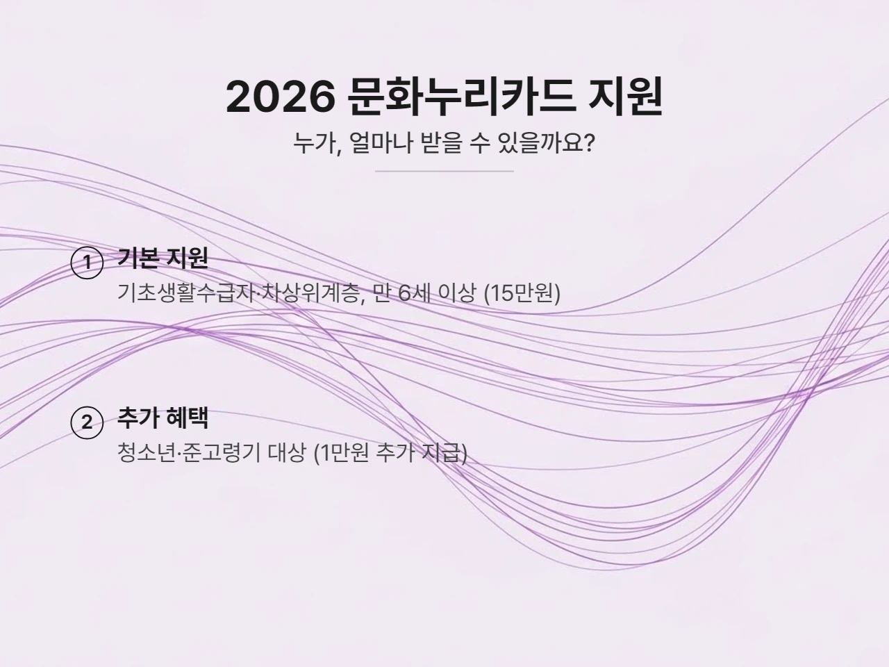 2026년에는 기본 15만 원에 더해, 특정 연령대에는 추가 1만 원이 지급되어 최대 16만 원까지 혜택을 누릴 수 있습니다. 이 추가 혜택은 문화누리카드를 더욱 풍성하게 만들어주는 요소라고 생각해요.