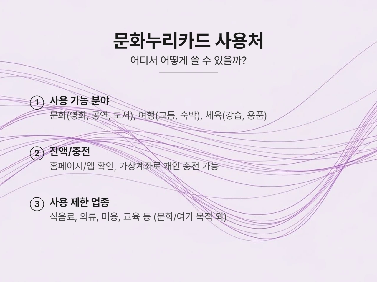 친구가 문화누리카드로 서점에서 커피를 사 마시려다 결제가 안 된 적이 있어요. 서점은 문화 가맹점이지만, 커피는 식음료라 안 되는 거죠. 이렇게 '문화·여행·체육' 목적과 직접 관련 없는 품목은 대부분 사용이 제한된다고 생각하면 편합니다.